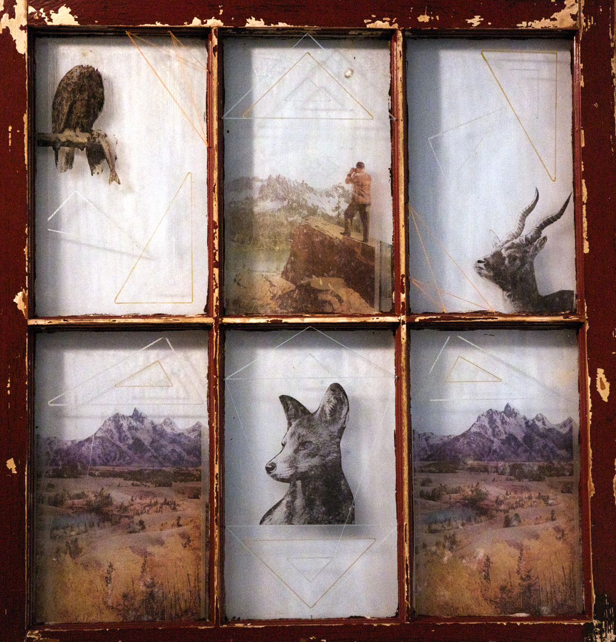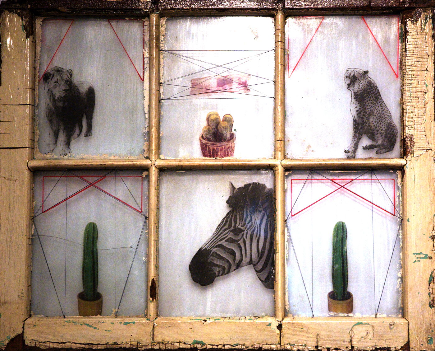 Polaroid/Image transfers onto reclaimed window with paint and thread embellishment